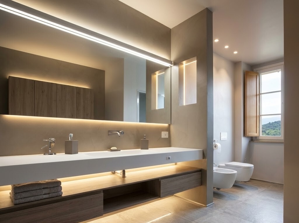 Add a spa-like ambience with hidden LED strips around mirrors or bath areas.